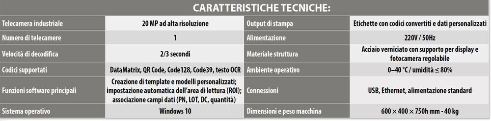 La Simplidied Code Conversion Machine è un sistema compatto e intelligente progettato per automatizzare la lettura, l’elaborazione e la ristampa di etichette con codici 1D, 2D e testo OCR. Grazie a una telecamera industriale ad alta risoluzione e a un software avanzato di riconoscimento, la macchina identifica con precisione codici e dati presenti sulle etichette originali, li elabora in base ai parametri impostati e genera automaticamente nuove etichette conformi agli standard richiesti. L’operatore può creare modelli personalizzati, impostare aree di lettura e collegare i diversi campi dati come numeri di parte (PN), codici cliente, quantità, lotti o date, garantendo così una perfetta corrispondenza tra i dati originali e quelli convertiti. Il sistema consente inoltre di configurare separatori, formati di data e contenuti manuali, offrendo la massima flessibilità nelle applicazioni industriali. Dopo la fase di riconoscimento, la macchina esegue automaticamente la stampa dell’etichetta convertita, riducendo drasticamente i tempi di lavorazione e gli errori di trascrizione. L’interfaccia grafica intuitiva e il flusso operativo guidato rendono il processo semplice anche per operatori non specializzati, mentre la struttura robusta e compatta assicura affidabilità e facilità di integrazione nelle linee di produzione esistenti. Vantaggi: • Automazione completa del processo di riconoscimento e conversione dei codici • Riduzione degli errori manuali e dei tempi di gestione • Interfaccia intuitiva con impostazioni guidate passo-passo • Flessibilità nella gestione di codici e formati diversi • Facile integrazione in ambienti produttivi e sistemi informatici aziendali |